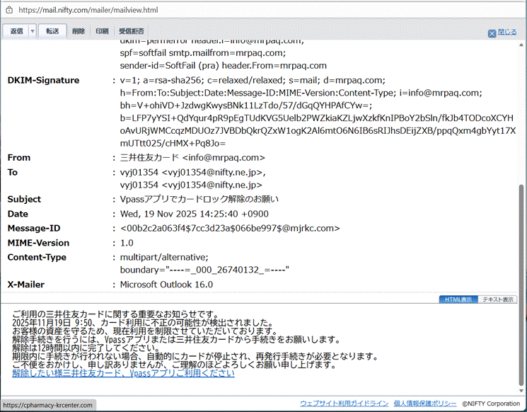 メールに記載された解除したい様三井住友カード、Vpassアプリご利用下さいは