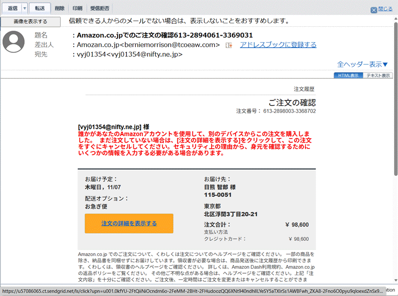 メール中の「注文の詳細を表示する」にカーソルを当てると、上の図の下部に表示された変なURLを表示。