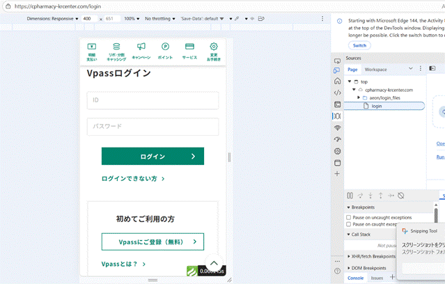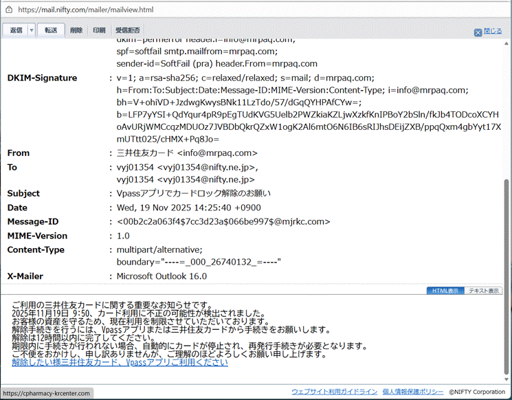 メールに記載された解除したい様三井住友カード、Vpassアプリご利用下さいは https://cphamacy-krcenter.comにリンクされていた。